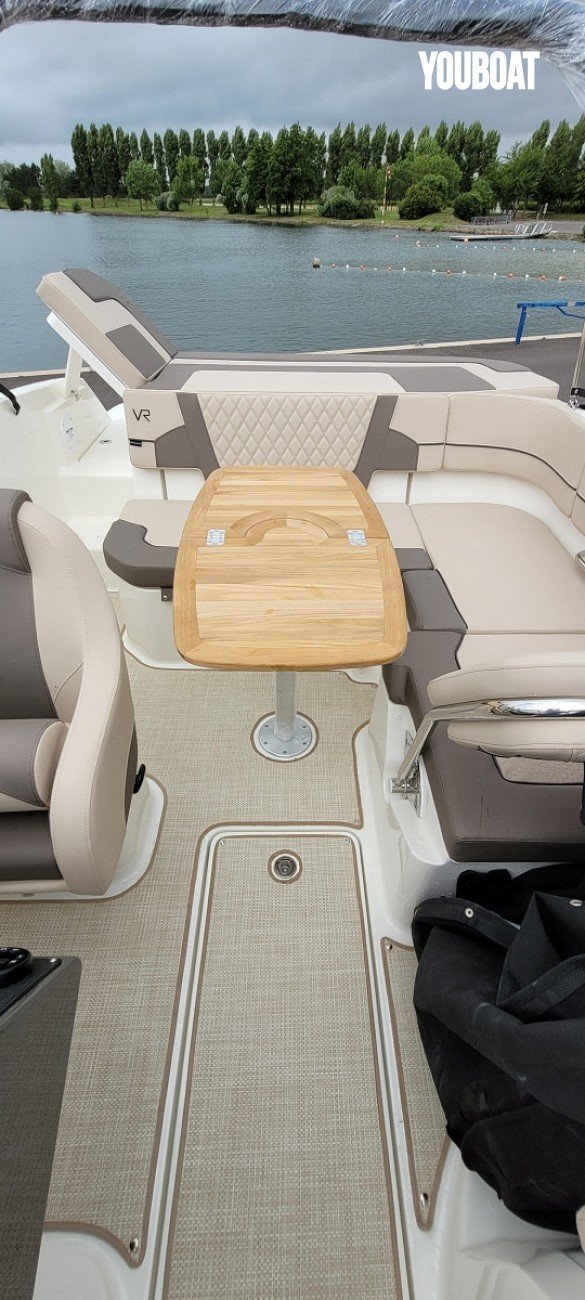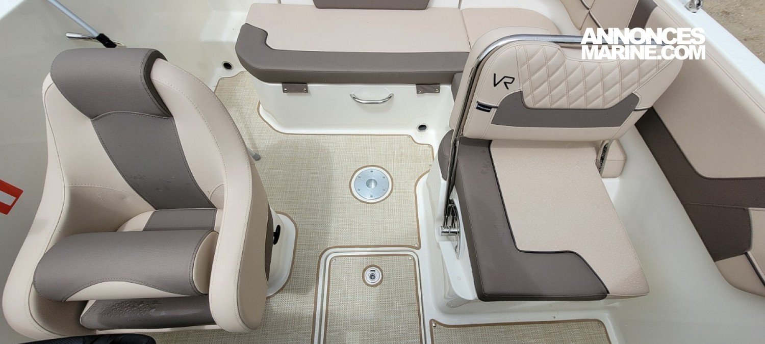 - Options : Pack Preferred sans sisal, Ecran Simrad GO9, Pack coussins, Mât de ski, Sellerie Desert Sand, Seadeck cockpit & plateforme de bain, Double enceinte de pont avant, Douchette de cockpit